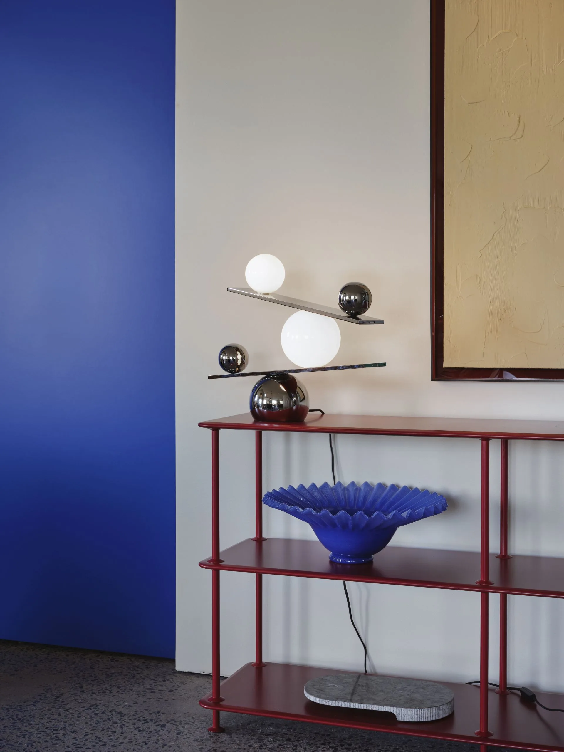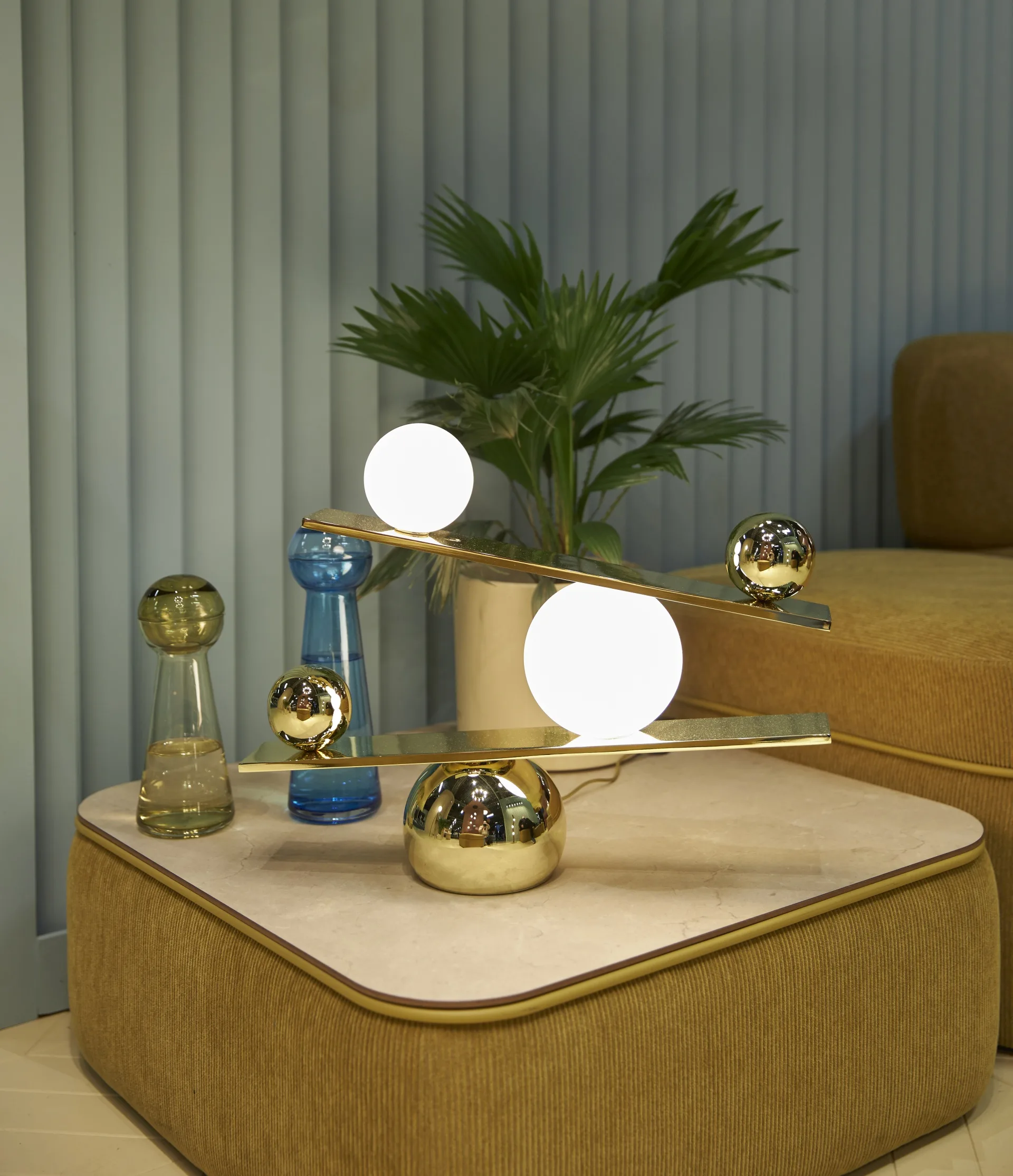 The Balance Table Lamp explores motion and time in a sculptural form: two opal-glass orbs appear to pause mid-movement, creating poetic light-and-shadow effects when lit. Set between slanted steel planes and counterweighted by precision-made metal spheres, this designer table lamp achieves a seemingly impossible equilibrium.